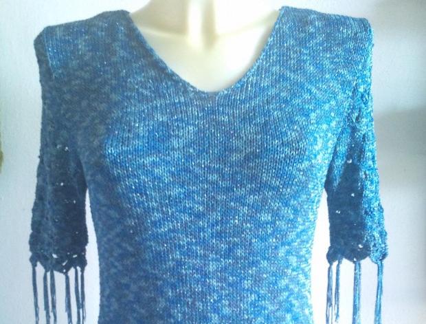 Halenka z nádherné příze v několika odstínech modré s jemným stříbrným nádechem. Kvalitní příze fy Lang. Velikost tak 40-46,příze je pružná, při plnějších tvarech se halenka o trochu zkrátí. Délka cca 65-70cm.Rukávky a dolní okraj zdobené drobným dírkovým vzorem a obháčkované. Třásně u rukávků mohu na přání odstranit, ale prý jsou teď in. Realu odpovídá nejvíce hlavní fotka, po rozkliknutí se snad dopočítáte všech barevných nuancí příze..
