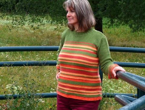 Pletený svetr z kvalitní směsové příze s vysokým podílem bavlny ve veselých podzimních barvách - lahvově zelené, cihlově červené, oranžové a meruňkové.