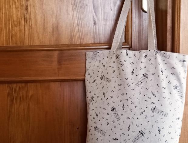 Taška je ušitá z pevné bavlněné látky vyšší gramáže v béžové barvě s jemným černým hudebním vzorem. Uši jsou z béžového popruhu. Šířka 32,5 cm, výška 43 cm, výška uší cca 28 cm.