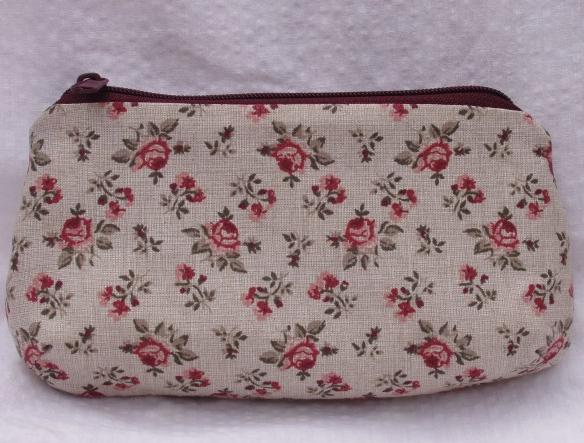 Kosmetická taštička z béžové režné bavlny s motivem růžiček, uvnitř bordo bavlna.