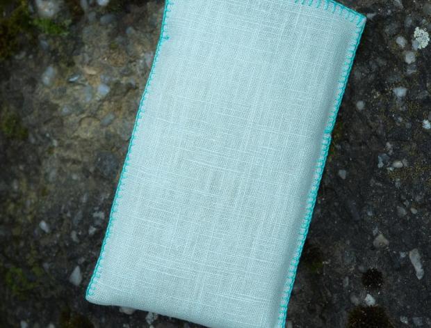 Obal na mobil je ušitý ze lněného plátna, které je vypodložené vatelínem. Je měkký a chrání před nárazy (aspoň trošku :-) ). Lněná látka je světle mátové barvy, motiv je vyšitý ručně, také obšití je ruční.