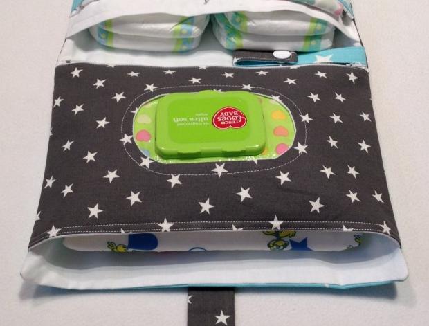 Pod kapsou s vlhčenými ubrousky je velká kapsa (rozměry 18 x 27 cm), do které se vejde přebalovací podložka.