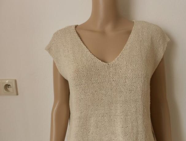 Dámská, ručně pletená letní halenka nebo vesta do pasu z hedvábí natur, které má pozitivní a léčebné účinky na pokožku. Velikost L,XL: délka 50cm, šířka 46cm.