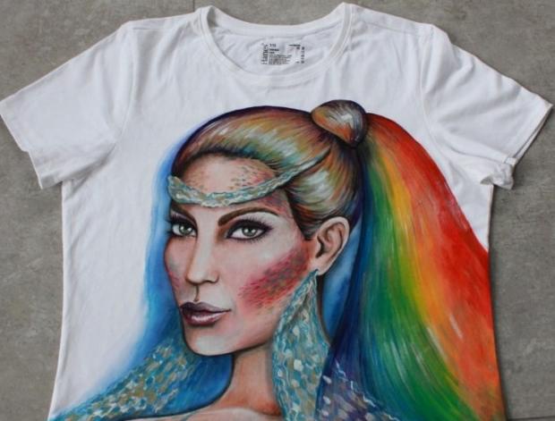 Ručně oboustranně malované dámské tričko s originálním motivem duhové paní, na kterou byly použity metalické barvy. Stačí zadat velikost (ideální je šířka Vašeho oblíbeného trička) a barevnost trička. Použité textilní barvy zn. Pébéo zajišťují při praní z rubu na 30°C stálobarevnost. Osobní odběr možný v Pardubicích nebo Hořicích.