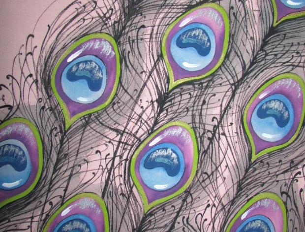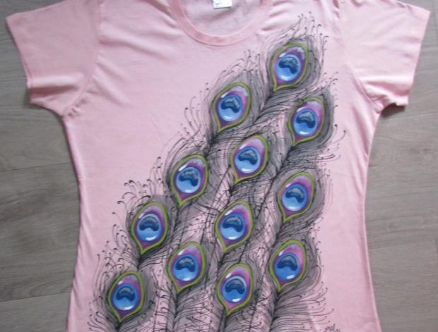 Ručně malované dámské tričko s originálním motivem pavích per. Do objednávky stačí zadat velikost (ideální je šířka Vašeho oblíbeného trička) a barevnost trička. Použité barvy zn. Pébéo zajišťují při praní z rubu na 30°C stálobarevnost. Žehlit též z rubu. Možnost odběru v Pardubicích.