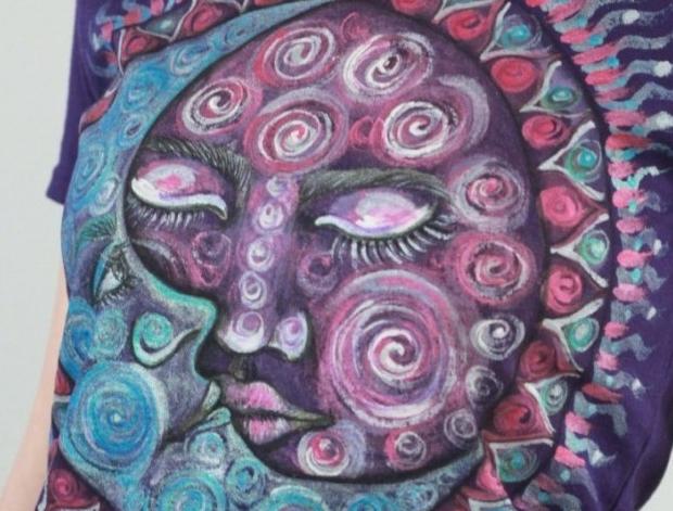 Ručně malované dámské tričko s originálním motivem slunce a měsíce, na které byly použity metalické barvy. Kvalitní tričko zn. Fruit of The Loom má tmavě fialovou barvu a kulatý výstřih, je ze 100% bavlny a v gramáži 170 gr/m2. Od horního okraje měří 52 cm, v nejširším místě 40 cm. Použité barvy zn. Pébéo zajišťují při praní z rubu na 30°C stálobarevnost. Žehlení též z rubu. Možnost odběru v Pardubicích.