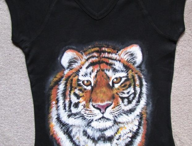 Ručně malované dámské tričko s motivem tygra. Kvalitní tričko zn. Lambeste je v gramáži 210 gr/m2, ze 100% bavlny, s krátkým raglánovým rukávem a výstřihem do "V". Lze objednat velikosti S-XL v barvě černé, červené, bílé nebo nebesky modré. Použité textilní barvy zn. Pébéo zajišťují při praní z rubu na 30°C stálobarevnost. Možnost odběru v Pardubicích.