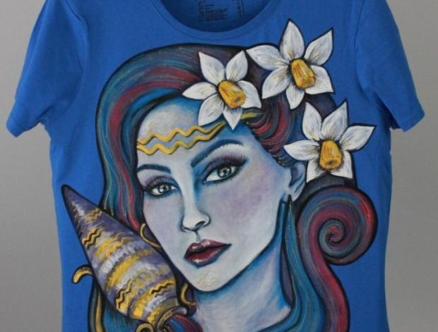 Ručně malované dámské tričko s originálním motivem znamení vodnáře na který byly použity i metalické barvy. Stačí zadat velikost (ideální je šířka Vašeho oblíbeného trička) a barevnost trička. Použité barvy zn. Pébéo zajišťují při praní z rubu na 30°C stálobarevnost. Žehlit též z rubu. Možnost odběru v Pardubicích.