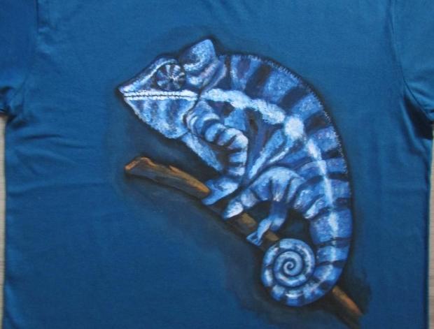 Ručně malované pánské či dámské tričko s chameleonem. Stačí zadat velikost (míry přes prsa) a barevnost trička. Použité barvy zn. Pébéo zajišťují při praní z rubu na 30°C stálobarevnost. Žehlit též z rubu. Možnost odběru v Pardubicích.