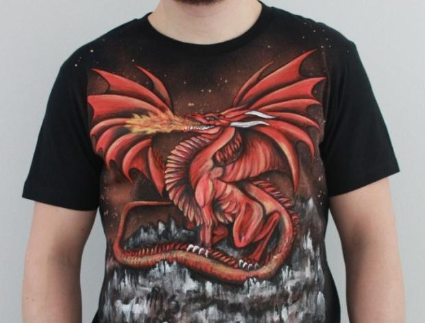 Ručně malované a savované pánské tričko s motivem červeného draka na který byly použity i metalické barvy. Stačí zadat velikot (ideální je šířka Vašeho oblíbeného trička) a barevnost trička. Použité textilní barvy zn. Pébéo zaručují při praní z rubu do 40°C stálobarevnost. Žehlení též z rubu. Možnost