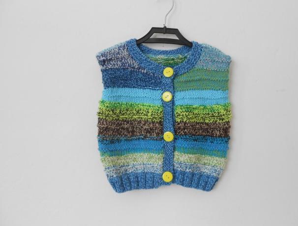 Kojenecká ručně pletená vestička, velikosti 68-74, délka 31cm, šířka 31 cm. Materiál: 60% merino, 20% akryl, 10% vlna, 10% bavlna.