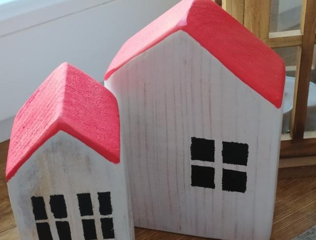 Domečky jsou jen lehce opracované, dřevo má různé nerovnosti, které jsem nechala. Nátěr je provedený akrylovou barvou. Domečky nejsou ošetřeny žádným lakem ani jiným nátěrem, proto nedoporučuju umístění venku.