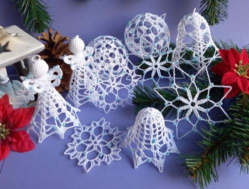 Háčkované ozdobičky z tenké 100% bavlněné příze, zdobené vháčkovanými korálky světle tyrkysové barvy, vypnuté a silně naškrobené, takže krásně drží tvar.