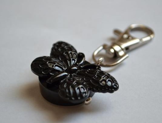 Motýlek s hodinkami, přívěsek s karabinkou lze umístit na kabelku, peněženku, poutko u kalhot. Rozměr motýlka 3,3 x 2 cm. Délka s karabinkou cca 6,5 cm. Nutno vyměnit baterii. V současné době nejdou.