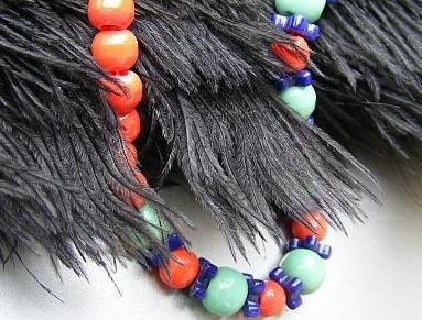 Unikátní, z nádherných skleněných krorálku , o délce cca 45 cm. Průměr zelené korálky cca 0,8 cm. Navlečeno na hedvábné niti. Uzávěr jednoduchý, provlékací. Velmi zachovalý stav. Nadčasový kousek, skvěle sladěné barvy, červená vypadá jako pravý korál. Skvělý doplněk !!!
