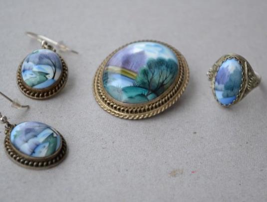 Brož o rozměru 4 x 3,5 cm, náušnice bez háčku cca 2,3 x 2,1 cm, délka s háčkem cca 4,1 cm. Koruna prstenu o rozměru cca 2 x 1,7 cm. Vnitřní průměr obroučky cca 1,7 cm. Velikost na trnu 52. Smalty jsou vsazeny nádherném, pravém, ručně vytvářeném filigránu z obecného kovu. Velmi pěkný stav.