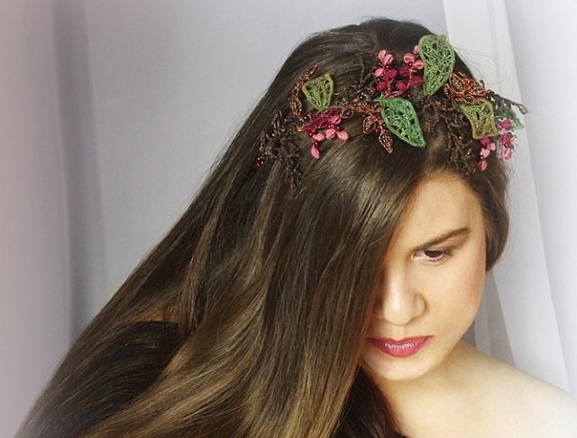 Čelenka v přírodních barvách z ručně paličkované krajky, složená z bobulí, lístků a větviček, doplněna perličkami a drobnými korálky. Vytvořena z bavlněných a metalických přízí a jemného drátku.