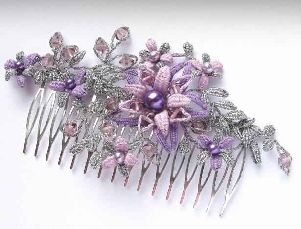 Hřeben do účesu z ručně paličkované krajky. Barva stříbrno-fialková, délka krajky 11cm. Materiál metalické a bavlněné příze, jemný drátek, kamínky a perličky. Krajka je pevně našita na kovovém hřebínku.