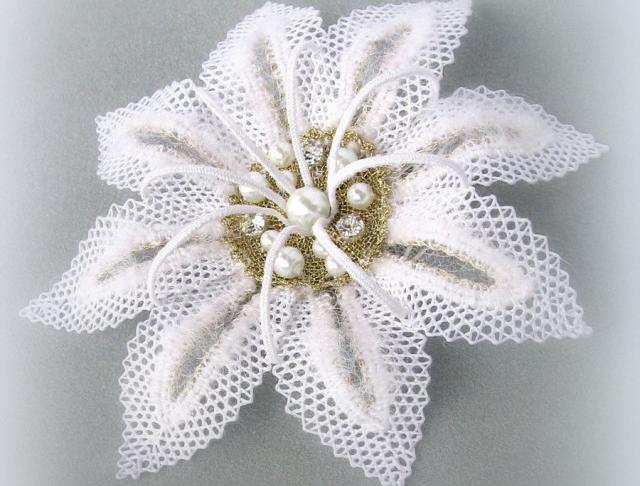 Květ do účesu z ručně paličkované krajky. Barva bílá, uprostřed lístků bílá rozčesaná vlna, která působí sněhově. Střed květu je zlatý, pošitý perlami a štrasem. Průměr květu je 12cm a je našit na kovovém hřebínku. Mohu vyrobit i v jiné barevné kombinaci.